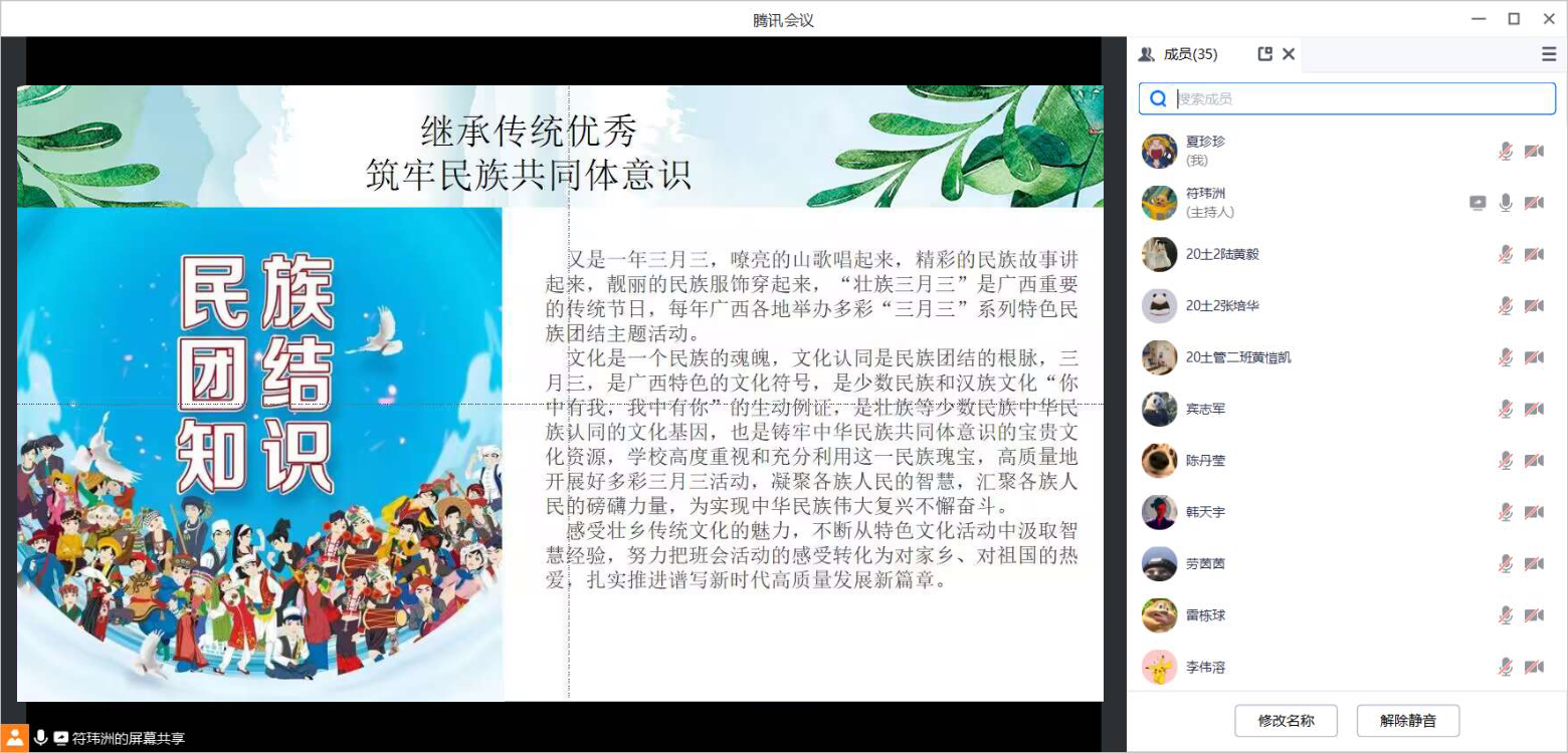 为铸牢中华民族共同体意识,弘扬优秀传统民族文化,凝聚各民族情谊,营造校社共育、共乐的良好氛围,根据《自治区教育厅关于开展2024 年“广西三月三”民族团结进步宣传月活动的通知》 (桂教民政〔2024〕3 号)要求,学院结合实际情况,开展了2024年民族团结进步宣传月主题班会。