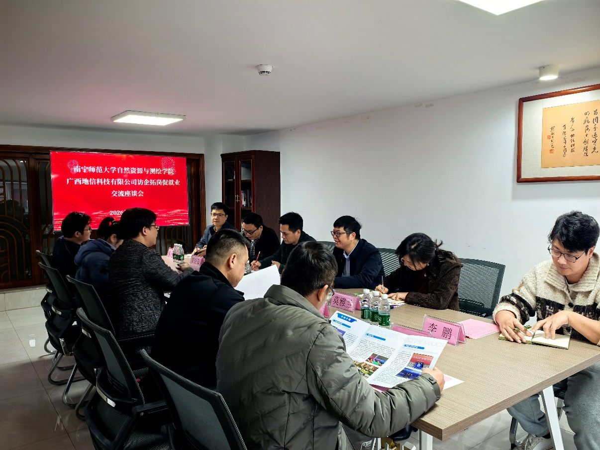 为进一步加强校企合作,拓宽毕业生就业渠道,了解企业人才需求,向企业精准推介毕业生,推动产教研深度融合。2026年2月3日,学院院长陆汝成、党委副书记全广铭(主持党委工作)、党委副书记莫雅兰、房地产开发与管理系主任娄信强、土地资源管理系副主任张利国以及测绘工程系副主任李鹏等一行前往广西地信科技有限公司开展“访企拓岗”促就业调研活动。广西地信科技有限公司总经理李睿华、综合规划部部长李雪君、检测实验室主任黄永和以及技术主干余潮等参加了此次调研座谈。