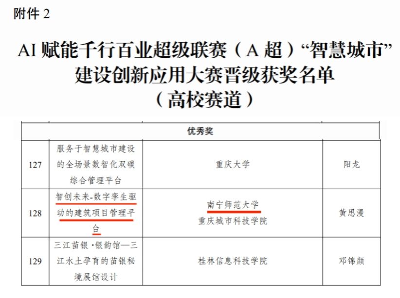 牵头,联合重庆城市科技学院,在王永卿老师、王妙灵老师、凌恺老师的悉心指导下,黄思漫等七名同学组成的队伍表现出色,凭借《智创未来-数字孪生驱动的建筑项目管理平台》项目,在AI赋能千行百业超级联赛(A超)“智慧城市”建设创新应用大赛(高校赛道)中荣获优秀奖。